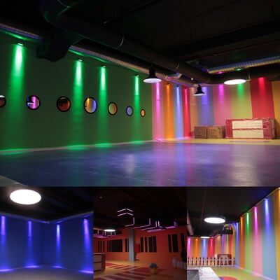 Ayrıca dekoratif duvar ışıklandırma sistemlerini iç mekanda da kullanabilirsiniz. Örneğin oyun salonu, çocuk oyun parkı veya eğlence mekanları için ortamı renklendirebilirsiniz. Bu dinamik atmosfer misafirleriniz için çok daha davetkar bir ortam olur. Aşağıda örnek olarak sunduğumuz iç mekan dekoratif duvar ışıklarını görebilirsiniz.