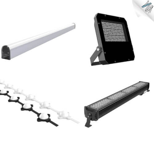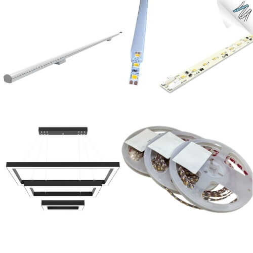 - Lineer LED: Alüminyum profil, PMMA difüzör kapak, yan kapaklar, montaj aparatları, PCB çubuk LED olarak parçaları vardır. Dış cephe için içerisi silikon kaplıdır.