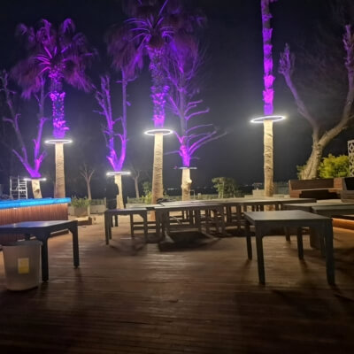 Palmiye aydınlatma çeşitleri peyzajın bir parçası haline gelmiştir. Bu işlem geceleri karanlıkta palmiye ağaçlarının gövdelerini ve yapraklarını ortaya çıkarır. Detayları vurgular. Farklı renklerde aydınlatma ağaçlara büyüleyici bir görünüm kazandırır. Bu şekilde tropikal görsel etkiyi gece bile devam ettirebilirsiniz.