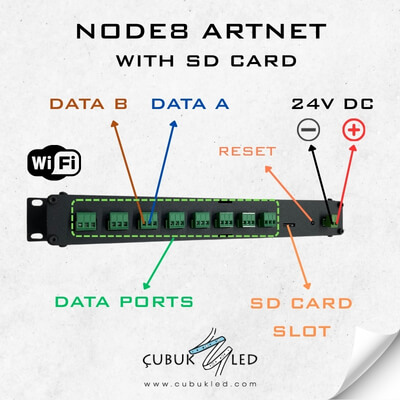 Контроллер DMX512 ARTNET с поддержкой SD-карт — это решение для ваших проектов с 8 вселенными, где вы не хотите использовать компьютер. Это устройство имеет 8 портов и может управлять в общей сложности 8 вселенными. Оно также оснащено модулем Wi-Fi, позволяющим подключаться к устройству через Wi-Fi с вашего компьютера. SD-карта позволяет добавлять анимационные патчи для светодиодов. Контроллер DMX512 с поддержкой SD-карты считывает и обрабатывает анимации, созданные вами с этой карты.