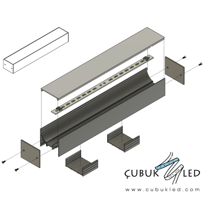 İlk olarak kasa içi LED çeşitlerinden birine sahip olmalısınız. Örneğin bir şerit led satın aldınız ve bu kasa içerisine yerleştirdiniz. Kasa rayına tam oturduğundan emin olmalısınız. Oturmuyorsa seçtiğiniz ledi çift taraflı ısı ileten termal bant ile sağlamca tutturmalısınız. Ayrıca bu led üzerinde delikleri bulunan alüminyum pcb ise vidalama yöntemini de kullanabilirsiniz. Kasanın en başına ve en sonuna ise opak yan kapakları kapatmalısınız. Bunlar da çelik vidalar ile sağlamca yerine oturur. En üste de plastik difüzör kapağı montaj etmelisiniz. Bu kapağa özel ray zaten kasa üzerinde olduğunda sağlamca yerine yerleşir.
